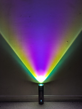 The light is a similar size to the previous generation of 10W portable zoomlights/spotlights (flashlight/torch) from a range of manufacturers (Photoolex, Sidande, SmallRig, Neewer, Ulanzi, etc, likely all made the same OEM). The head can be moved from flood to zoom, and the front lens can be changed by screwing the lens into the bezel. The spotlight module (best used with the light at flood end of the zoom) allows the gobos to be inserted via a magnetic slide. Each slide has a large and small version of the same pattern. The slide does not lock into place, which means the slot has to be at the top of the light otherwise it falls out. This limits the direction of some of the gobos, unlike the 10W models where the gobo can be turned 360 degrees. The gobos projections are also very narrow - more on that later.